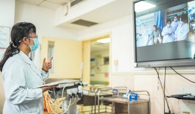 贵州省人民医院呼吸科医生通过“5G+”远程医疗平台对龙里县人民医院的患者给出治疗建议。
