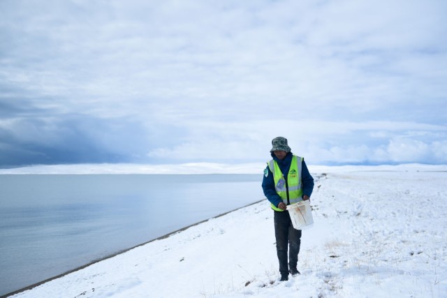 2021年10月20日,在青海省果洛藏族自治州玛多县扎陵湖乡勒那村,三江源国家公园黄河源园区生态管护员在扎陵湖边捡拾垃圾。新华社记者张龙 摄