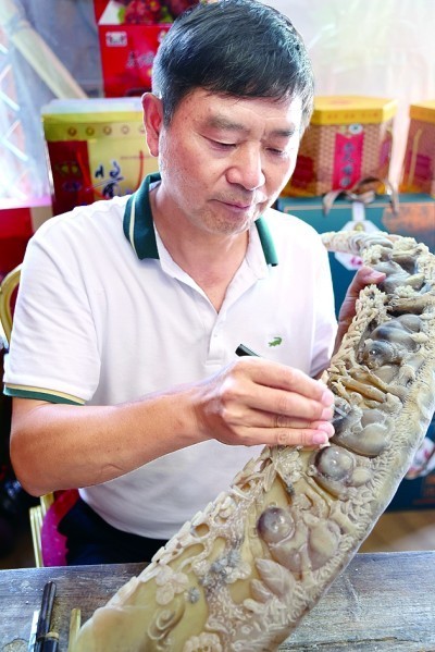 垫江角雕以稀有的黑、白牛角为主要原料,经手工雕凿而成。图为非遗传承人龙正东在制作角雕作品。本报记者 刘宇航摄