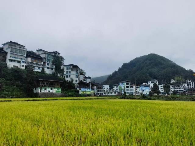 放眼望去,四周群山环绕、云雾飘渺,稻穗被饱满的谷粒压弯了腰,田里的鲤鱼隐约可见,受人脚步惊扰不时翻腾出水,溅起层层涟漪。