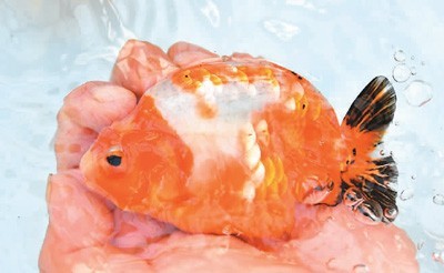 古城村春园鲤生态养殖场,养殖户向记者展示他们养殖的福寿品种金鱼。福寿是福州兰寿金鱼的简称,经过几代人改良的福州兰寿,多次在全国各类金鱼大赛中夺冠。
