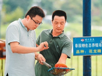 古城村龙头企业闽侯县春园鲤生态养殖场,科技特派员、福建师范大学生命科学学院博士黄镇(左)在与养殖场负责人张文春交流金鱼养殖技术。