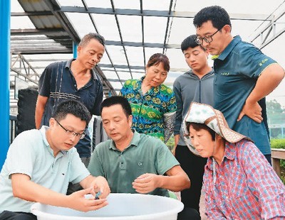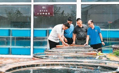关中村潘氏金鱼养殖基地,福建省科技厅、福州市科技局选派的科技特派员团队与养殖场负责人潘国诚(右二)在养殖场里探讨金鱼养殖技术。