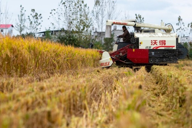 “赶着早上没有露水,我们7点多就开始收割,一直干到晚上7点。中午吃口盒饭,困了就在田上打个盹。”在湖北省天门市石家河镇唐店村,世宇家庭农场负责人李电平连日来守在田边。他指着一旁穿梭在田间作业的3台收割机说,从9月下旬开始秋收,机械帮了大忙,1台收割机1天能收四五十亩地。