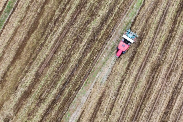 在湖北省荆门市沙洋县曾集镇金鸡村,五洋农机专业合作社社员操作机械设备播种油菜(无人机照片)。新华社记者杜子璇 摄