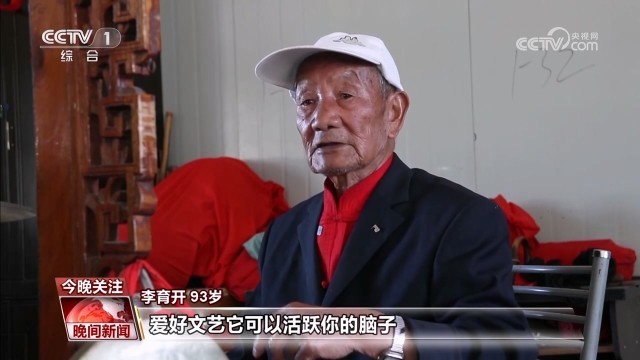 现在,李育开最快乐的事就是每天一边演奏乐器一边唱戏。当问及身体这么好的秘诀时,老人乐得像个孩子。