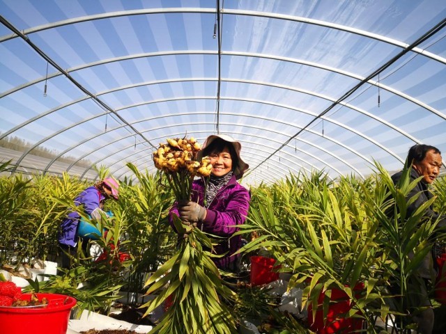 在山东姜公农业科技有限公司种植基地,大棚内种植的有机生姜迎来丰收。(新华社记者王志 摄)