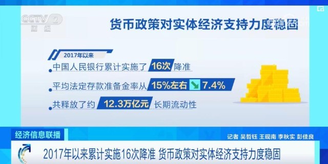 2017年以来,中国人民银行累计实施了降准16次,平均法定存款准备金率从15%左右降到7.4%,共释放了长期流动性约12.3万亿元,目前中国人民银行资产负债表规模基本稳定在42.7万亿元左右,我国广义货币(M2)余额和社会融资规模存量年均增速10%左右,与名义经济增速基本匹配,货币政策对实体经济支持力度稳固,金融服务实体经济质效提升。