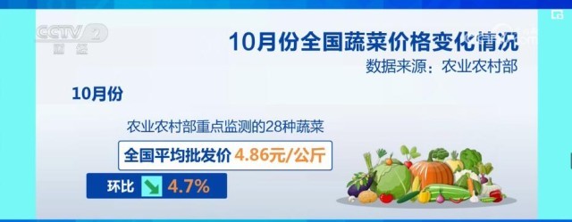 10月份,农业农村部重点监测的28种蔬菜全国平均批发价为每公斤4.86元,环比下降4.7%,同比基本持平。分品种看,环比价格19种下降,9种上涨。其中,降幅较大的有菠菜、大白菜、莴笋。