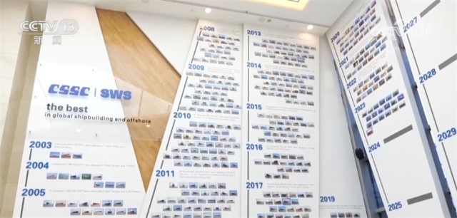 总台央视记者 吴天白:在中国船舶外高桥造船,我们发现了这样一面墙,墙上一共贴着553张已交付船型的照片。从最早的散货船、原油船,再到超大型液化气船、自升式钻井平台,包括今天要贴到这面墙上的国产首艘大型邮轮。我们可以看到,随着时间的推移,交付船型的附加值变得越来越高,这也体现着我国造船能力质的飞跃。
