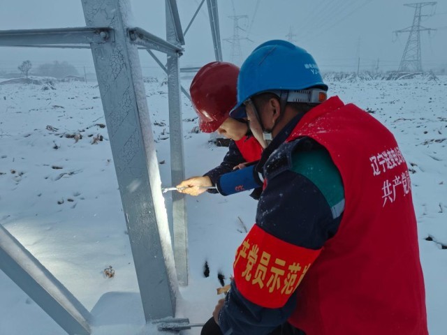 11月6日,辽宁省送变电工程有限公司燕都保险站运维人员进行极端天气保线特巡。(国网辽宁省电力有限公司供图)