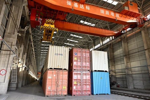 这是中国铁路乌鲁木齐局集团有限公司阿拉山口站换23集装箱换装库(11月4日摄)。新华社记者 李鑫 摄
