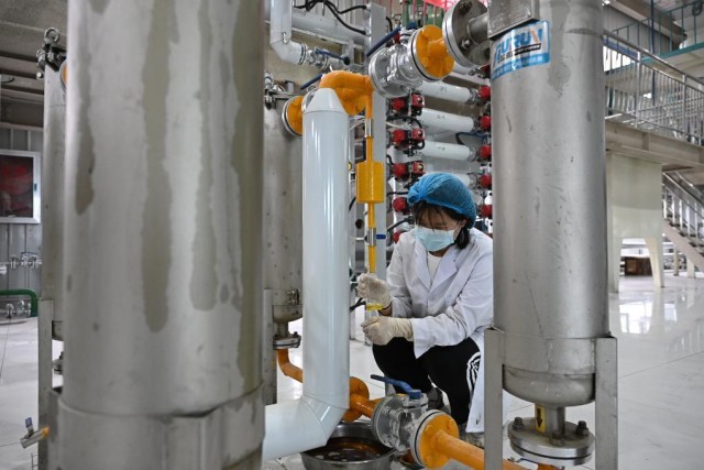 11月4日,阿拉山口金牧生物科技有限公司的工作人员在自动化物理精炼车间内提取亚麻籽油样本进行检验。新华社记者李鑫 摄