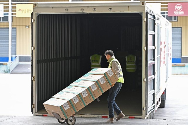 11月4日,阿拉山口综合保税区内的跨境电商分拣清关中心的工作人员正在将国产空调装车准备运往国外。新华社记者李鑫 摄