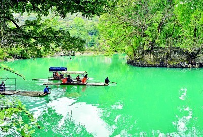 游客在黔南州大小井风景名胜区体验排筏摆渡。资料图片