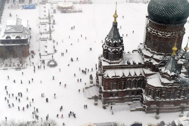 11月6日,游客在哈尔滨建筑艺术馆外游览(无人机照片)。当日下午,黑龙江省气象台继续发布暴雪红色预警信号。新华社发(刘洋 摄)
