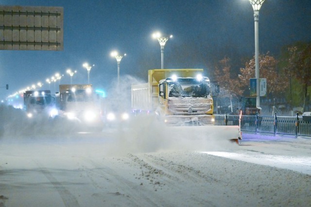 11月6日,清雪车在哈尔滨友谊西路上清除路面积雪。当日下午,黑龙江省气象台继续发布暴雪红色预警信号。新华社记者 陈益宸 摄