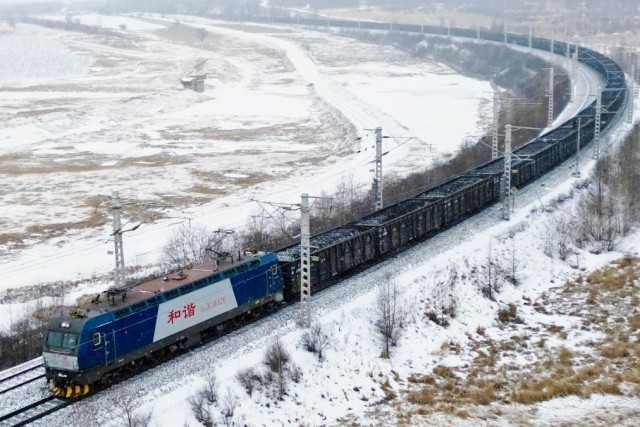 运输物资的火车在寒风中呼啸而过。(中国铁路哈尔滨局集团有限公司供图)