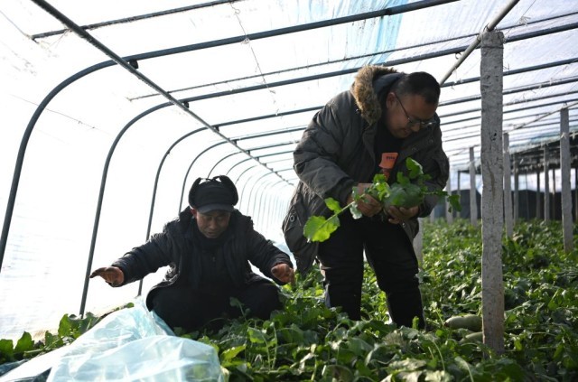 郭庆(右)和父亲一起在大棚里采摘沙窝萝卜(12月22日摄)。新华社记者李然摄