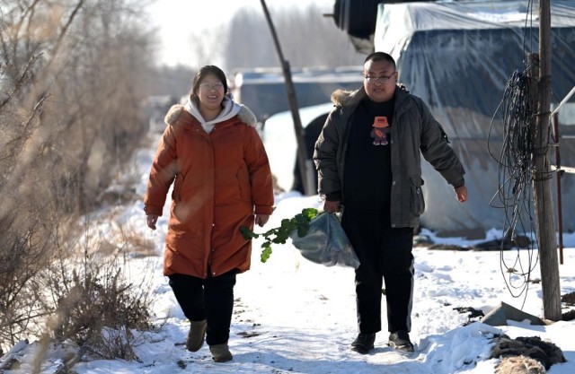 夫妻俩带着刚采摘的沙窝萝卜准备回去开播(12月22日摄)。新华社记者李然摄