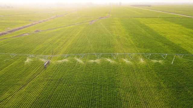 3月19日,河南省南阳市新野县施庵镇的小麦高标准农田示范方里,数台高效节水喷灌机正在进行“一喷三防”作业。(图片来源:视觉中国)