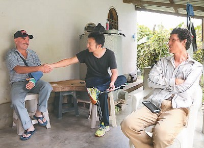中洪联合考古队成员李默然(中)和遗址工作人员交流。
