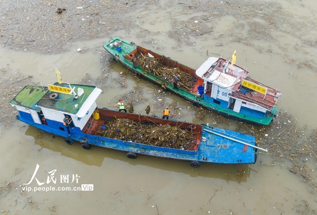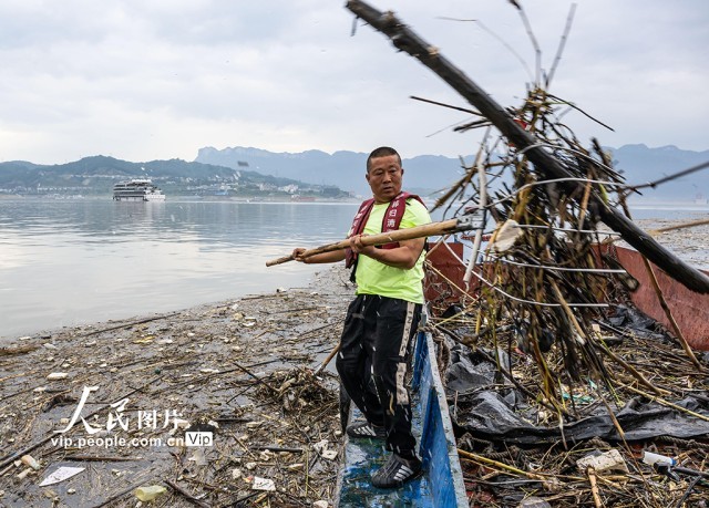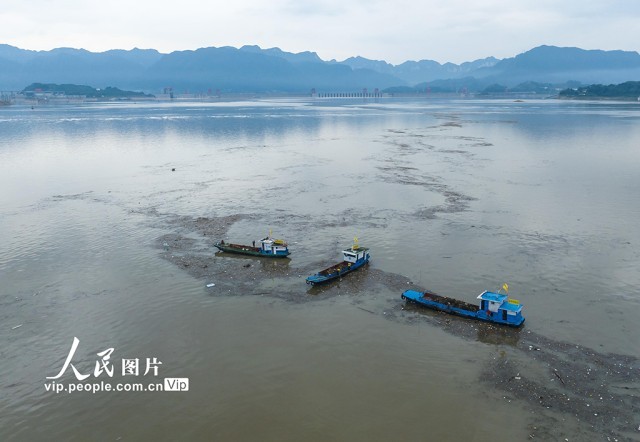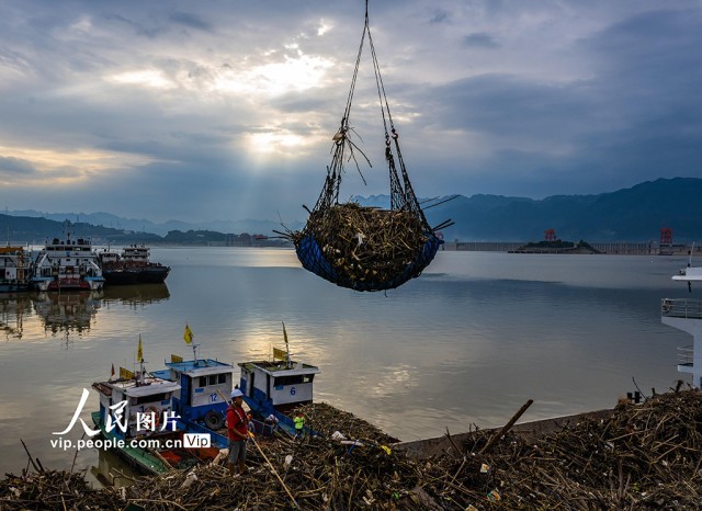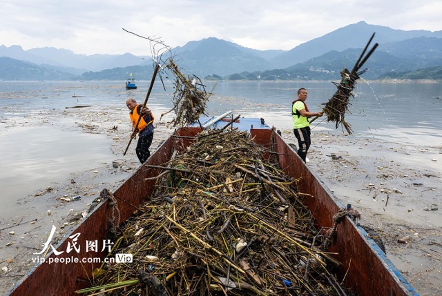 长江进入主汛期以来,秸秆、树枝、塑料等漂浮物随波逐流,聚集到三峡大坝前和库区的江面上。三峡集团公司和湖北省宜昌市秭归县环保部门组织清漂工人全力清漂,以减轻漂浮物对三峡枢纽运行的影响,确保三峡水库水质不受污染,保障船舶航行安全。郑家裕摄(人民图片网)
