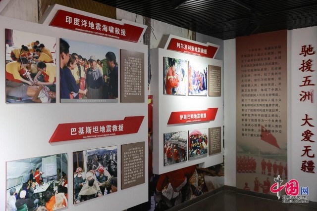 国家地震紧急救援训练基地展板上,贴满了救援队在全球开展应急救援的图文资料。中国网记者 董宁 摄影