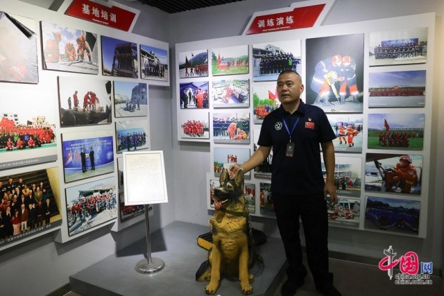 8月28日,国家地震紧急救援训练基地教官何红卫和记者介绍搜救犬的英雄事迹。中国网记者 董宁 摄影