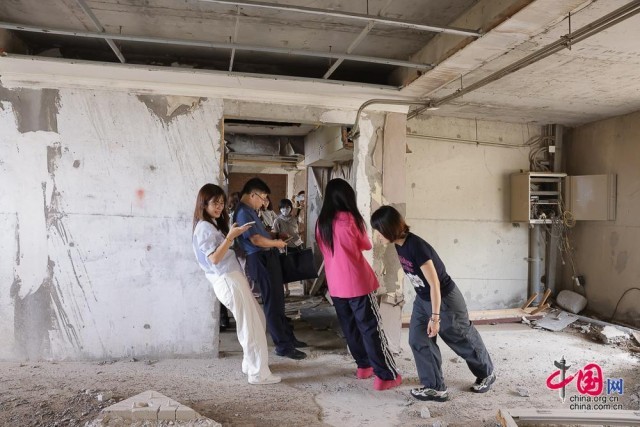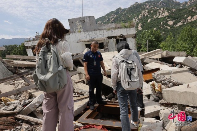 8月28日,国家地震紧急救援训练基地,记者们体验倾斜式倒塌训练废墟。中国网记者 董宁 摄影