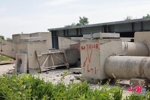 图为国家地震紧急救援训练基地倾斜式倒塌训练废墟,该废墟主要是模拟地震灾害发生后常见的建筑物倾斜破坏场景,倾斜一侧与地面平直处的原标高为3.5米,建筑倾斜度约19度。此场景供救援队员开展抗眩晕、高难度、人装结合等适应性搜救训练。中国网记者 董宁 摄影