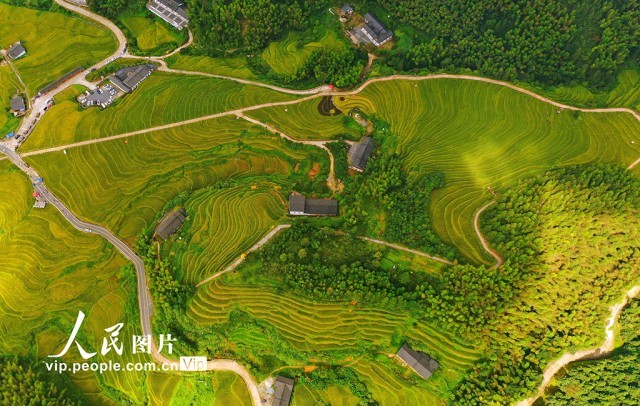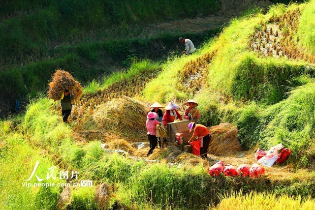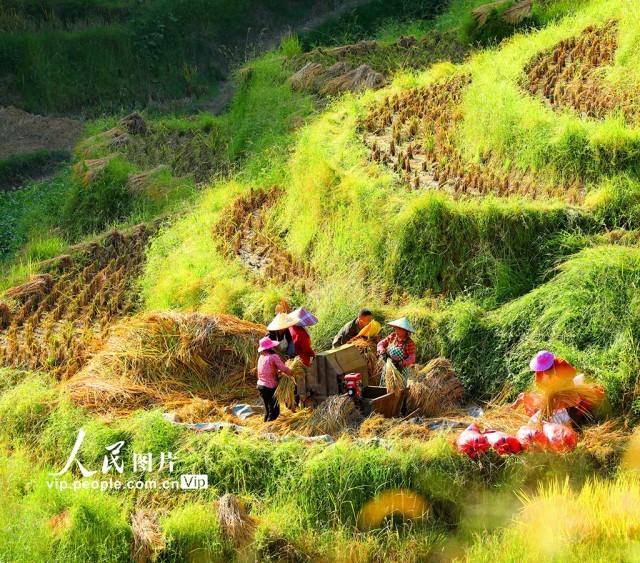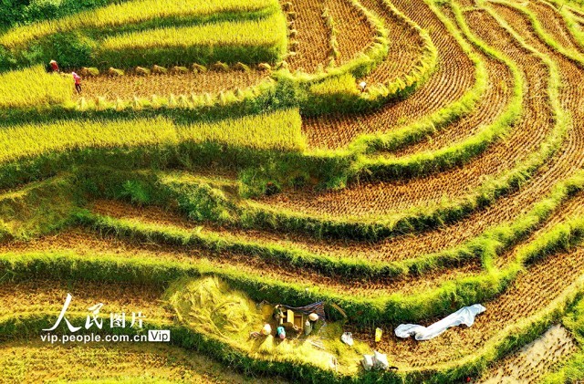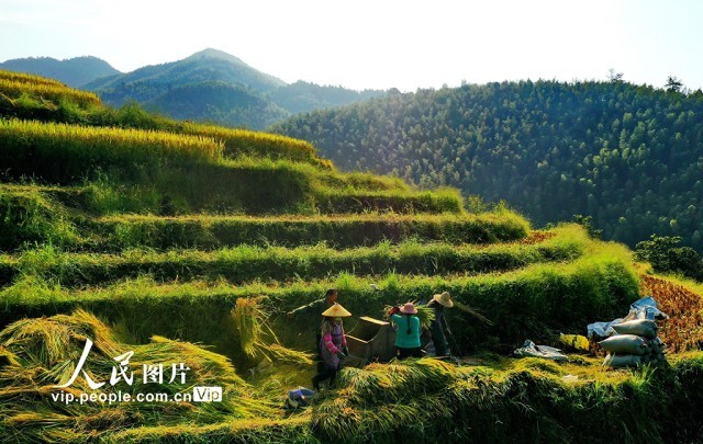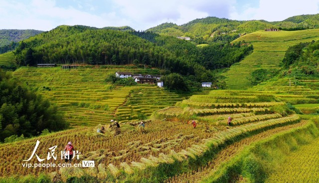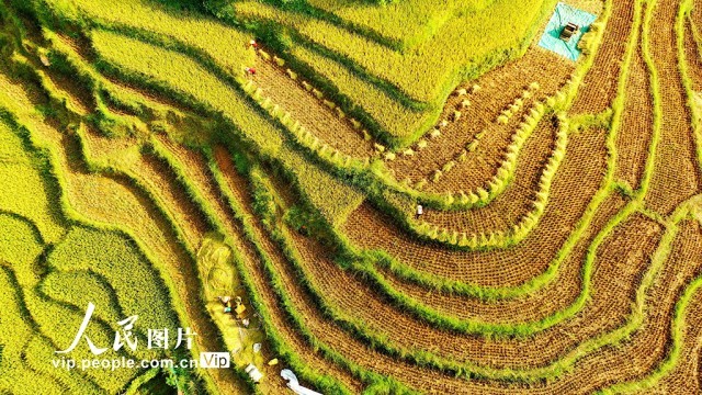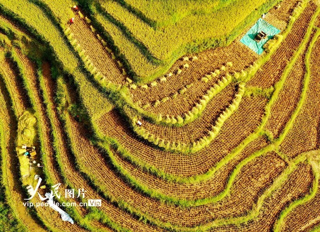 2024年10月13日,江西省赣州市崇义县上堡乡上堡梯田,梯田依山蜿蜒、层层叠叠,秋风中掀起层层金色稻浪,村民在田间割水稻,构成一幅山村丰收画卷。朱海鹏摄(人民图片网)
