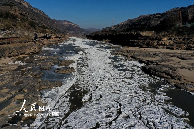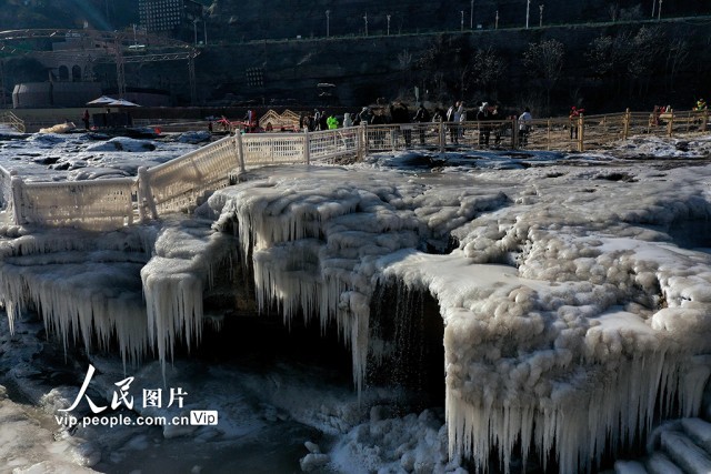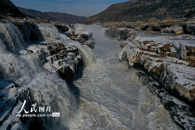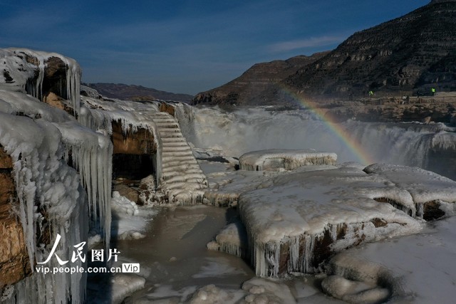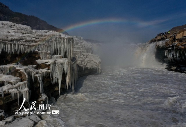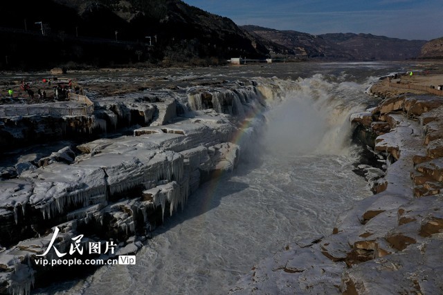 2024年12月16日,山西临汾市吉县黄河壶口瀑布呈现出壮观的流凌冰挂景观。近日,受持续降温天气影响,黄河壶口段出现大面积流凌,滚滚黄河水裹挟着流凌奔腾而下。飞溅的浪花和水雾在两岸岩石和护栏上凝结成层层叠叠的冰挂,与瀑布上空的彩虹交相辉映,使得冬日里的壶口瀑布更显别样壮观。吕桂明摄(人民图片网)