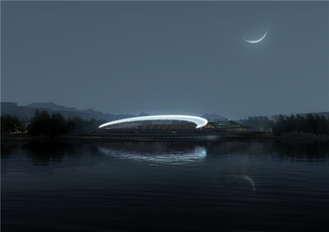 体育中心项目“月牙形”起伏的屋面与湖景相融,馆似岚湾,场如娴舒,构成一副醉人心脾的山月岚湾图。作为龙港市首个体育中心,其内设置与体育相关的休闲娱乐及餐饮购物,将体育与商业有机组合,16根500mm纤细钢柱支撑着3000吨大跨度屋盖,形成可容纳16000人的大型户外开放屋顶空间。