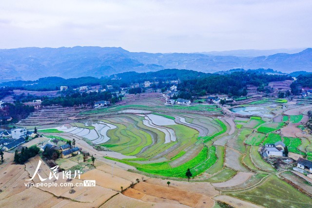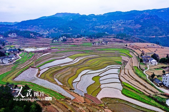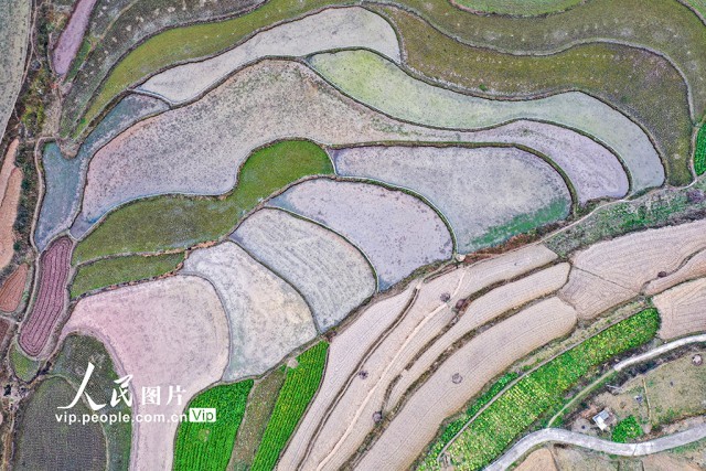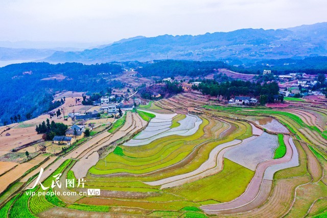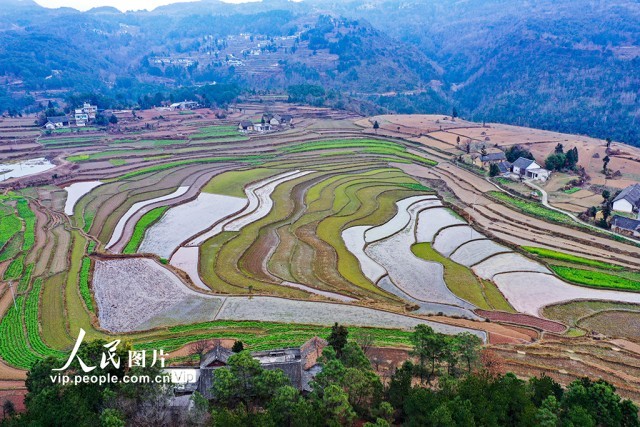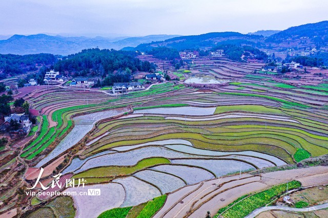初春时节,贵州省毕节市乌蒙山区黔西市锦星镇的高山梯田层层叠叠,宛如画卷,正蓄水备耕,美不胜收。胡毅摄(人民图片网)