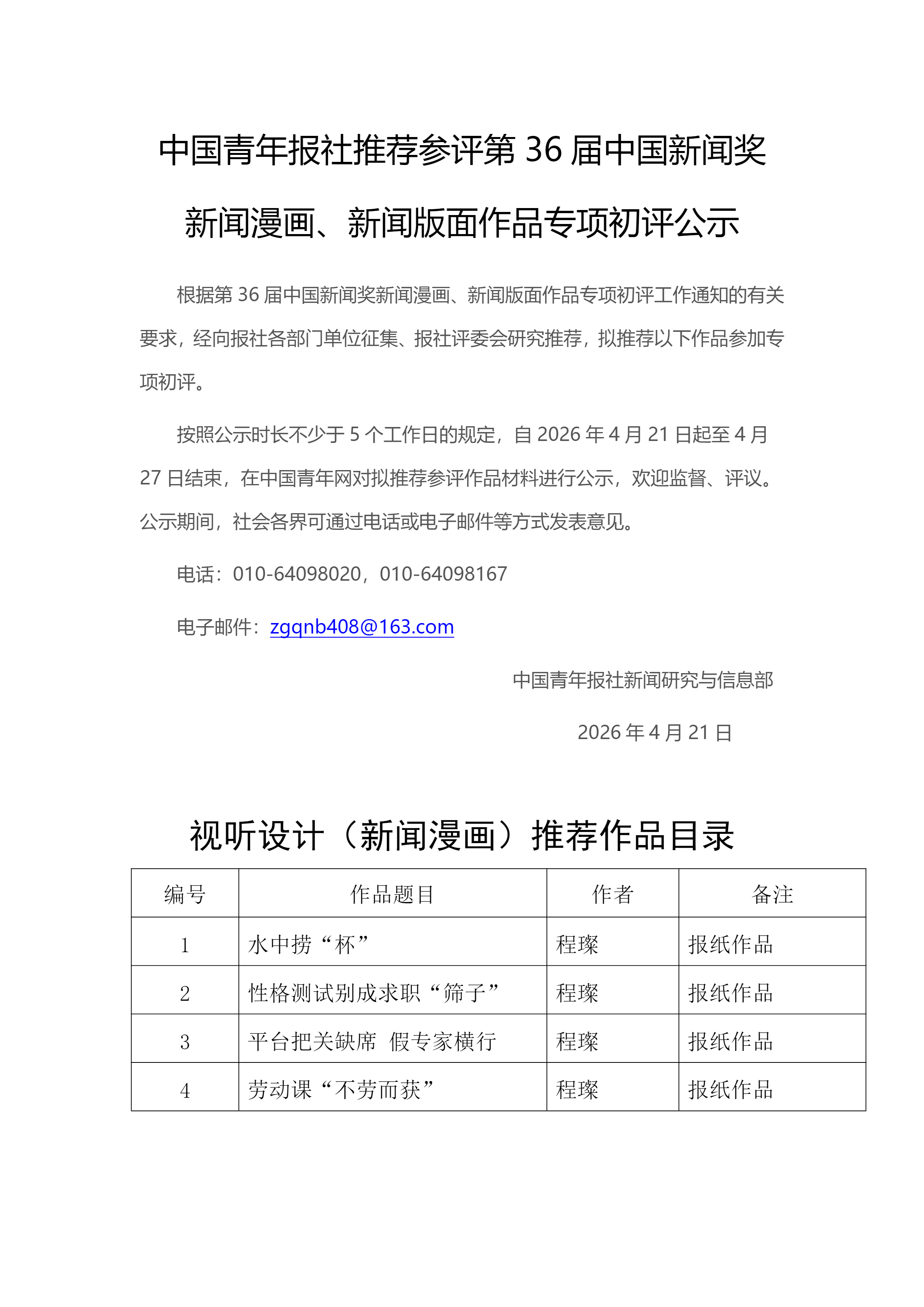 按照公示时长不少于5个工作日的规定,自2026年4月21日起至4月27日结束,在中国青年网对拟推荐参评作品材料进行公示,欢迎监督、评议。公示期间,社会各界可通过电话或电子邮件等方式发表意见。