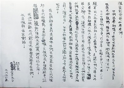 现在我们的住(驻)地距敌正面有五十多里路,敌人的远射程炮是可以打到的(已经打了几发),飞机也是天天在上空(旋),有时乱投弹,有时(旋)一(旋)也就走了,实际上不管你投弹打弹,不管多少磅重的炸弹、多么大口径的炮,是一点作用不起的。您们可能奇怪,并不奇怪,我们有积土十五公尺到三十公尺坑道公(工)事(即在山的脚下挖成洞子,山这边通到山那边,里面有休息室、粮弹保存室、上面是十五公尺到三十公尺的石头或土),在里面办公、打炮如同敲鼓声,只不过是给山削了个光头,给我们劈好了柴火,好叫我们做饭吃(意思是把山上的树都打光打断了,成了光山了,树枝断了,我们要烧水)。