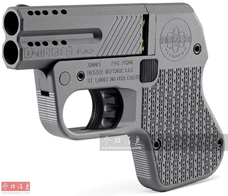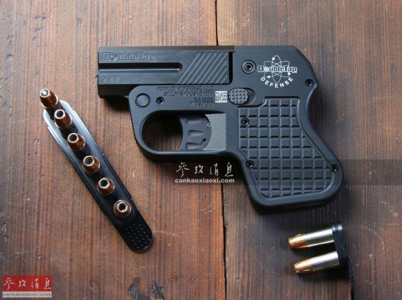 美国DoubleTap防务公司推出的9毫米双管防身袖珍手枪,由于未配备弹匣,该枪只能手动装填,备弹仅有2发,全重仅0.4千克,内置有两个击锤,第一次扣扳机击发上枪管,第二次击发下枪管。