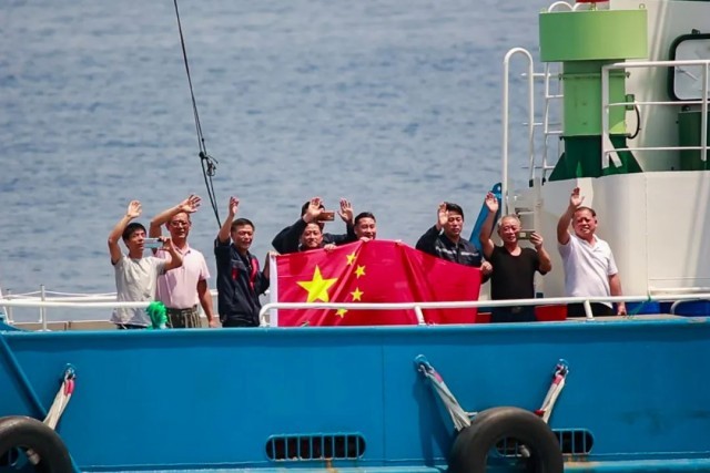 海军第40批护航编队岳阳舰为中国籍渔船护航,图为被护船舶船员展开五星红旗(胡韦楠 摄)