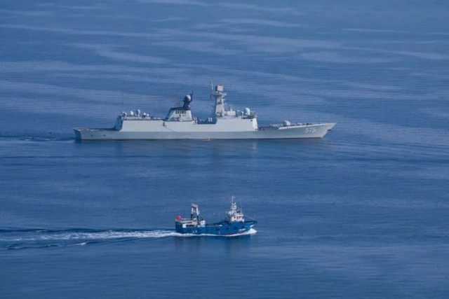 海军第40批护航编队岳阳舰为中国籍渔船护航(刘有权 摄)