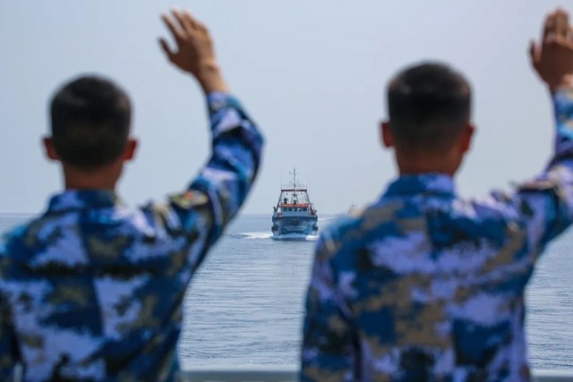 海军第40批护航编队岳阳舰为中国籍渔船护航,图为官兵向被护船舶挥手告别(胡韦楠 摄)