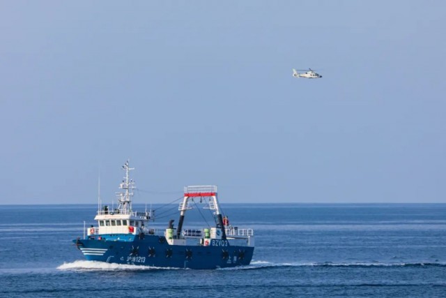 海军第40批护航编队岳阳舰为中国籍渔船护航,图为舰载直升机位周边海域巡逻警戒(胡韦楠 摄)