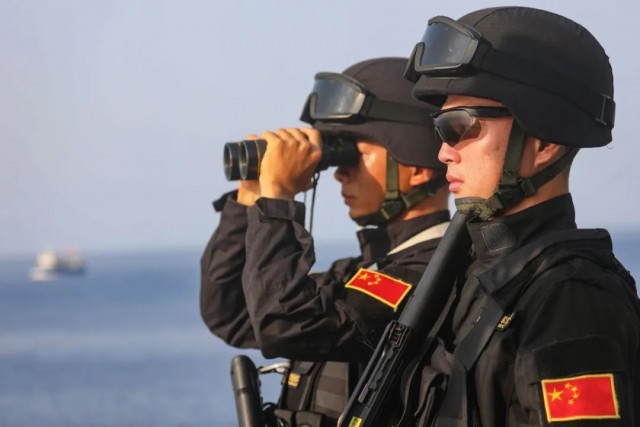 海军第40批护航编队岳阳舰为中国籍渔船护航,图为特战队员瞭望警戒(唐文 摄)