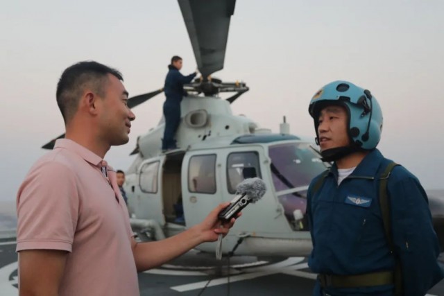 总台央广记者宋康飞(左)在岳阳舰起降平台采访舰载机机长贺力员(右)