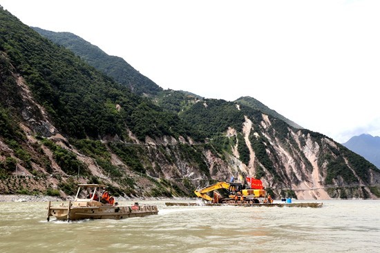 随着一台台重型挖掘机在大渡河对岸的芝麻沱、郑家坪等临时渡口抢滩登陆,左右开弓向两端施工作业,原本瘫痪的省道217线泸定至安顺场之间路段,慢慢恢复了通行。
