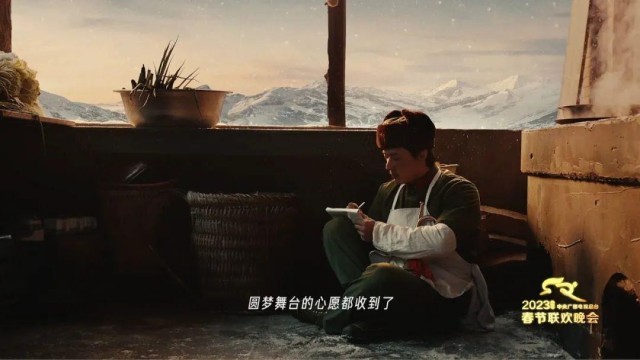 这是中央广播电视总台2023年春晚微电影《我和我的春晚》中的一幕。老兵,班长,军号,春晚,40年……这些元素汇聚在一起,共同在春晚的舞台上深情演绎出一个致敬解放军战士的感人故事。