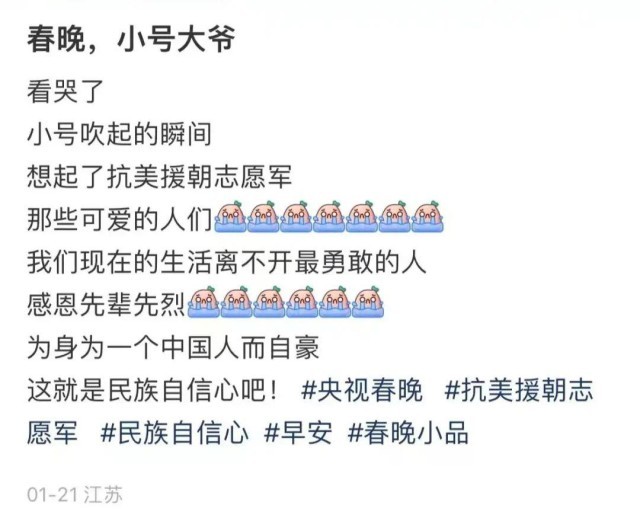 而需要深入挖掘才能找到的线索还有,在微电影之后承接的《早安,阳光》节目开头,站在春晚现场中央吹响开饭号的李春甫也是一名不折不扣的老兵。他于1978年在空降兵某部当了8年的指导员,这次登上春晚的舞台,挺拔的身姿、有力的吹奏背后是多年军旅生涯在他身上形成的鲜明印记。