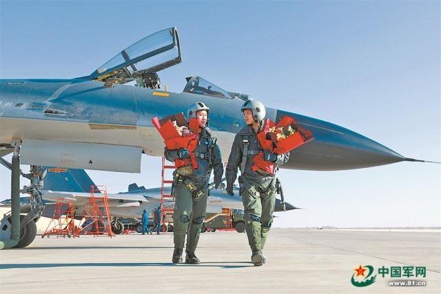 夕阳西下,随着最后一架战机平稳着陆,当日参训学员全部圆满完成了训练任务。返航归来,参训政治干部为他们送上鲜花,保障人员纷纷鼓掌祝贺。