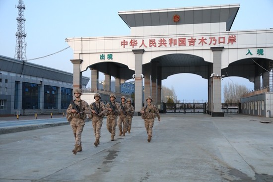 吉木乃边防连执勤官兵对国门区域进行巡逻。段伟/摄