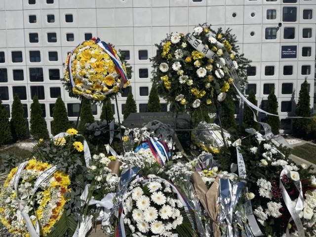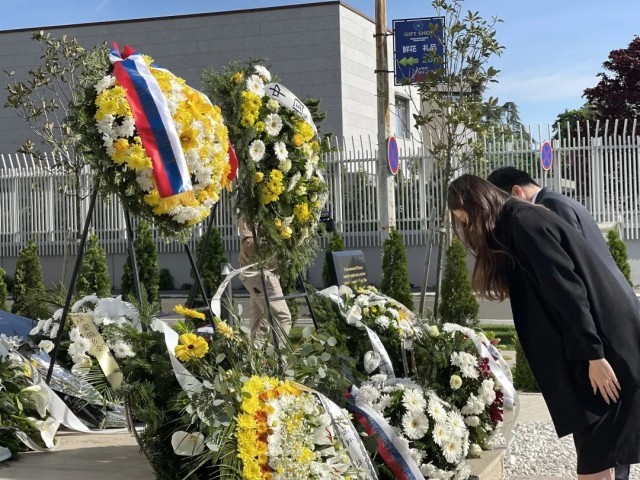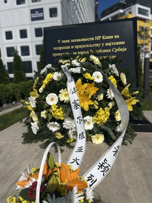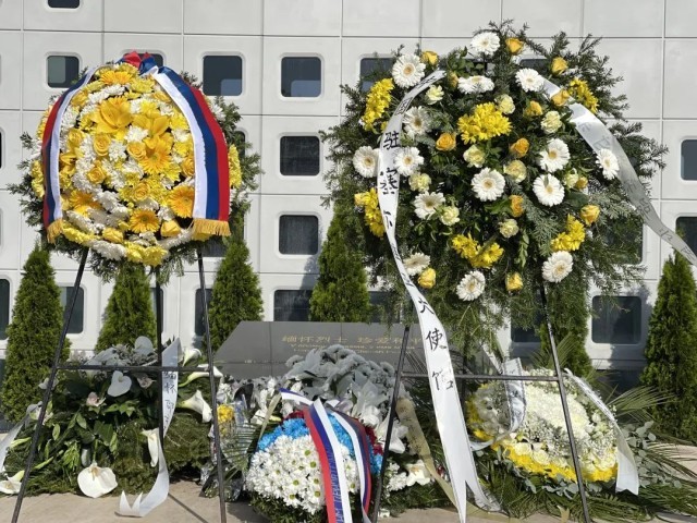 当地时间5月7日我驻南联盟使馆旧址前再次摆满鲜花悼念24年前在北约轰炸中牺牲的邵云环、许杏虎、朱颖烈士。